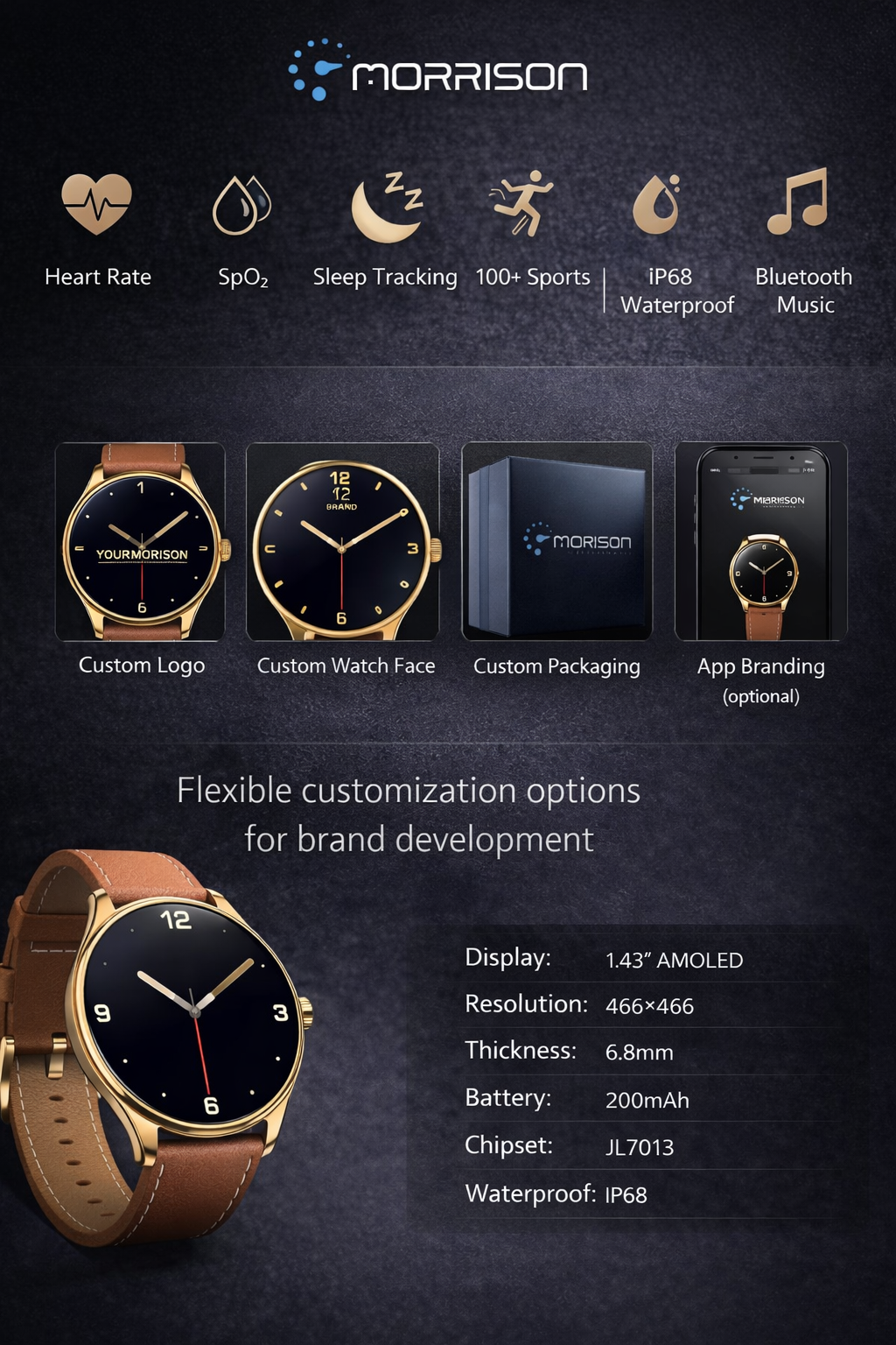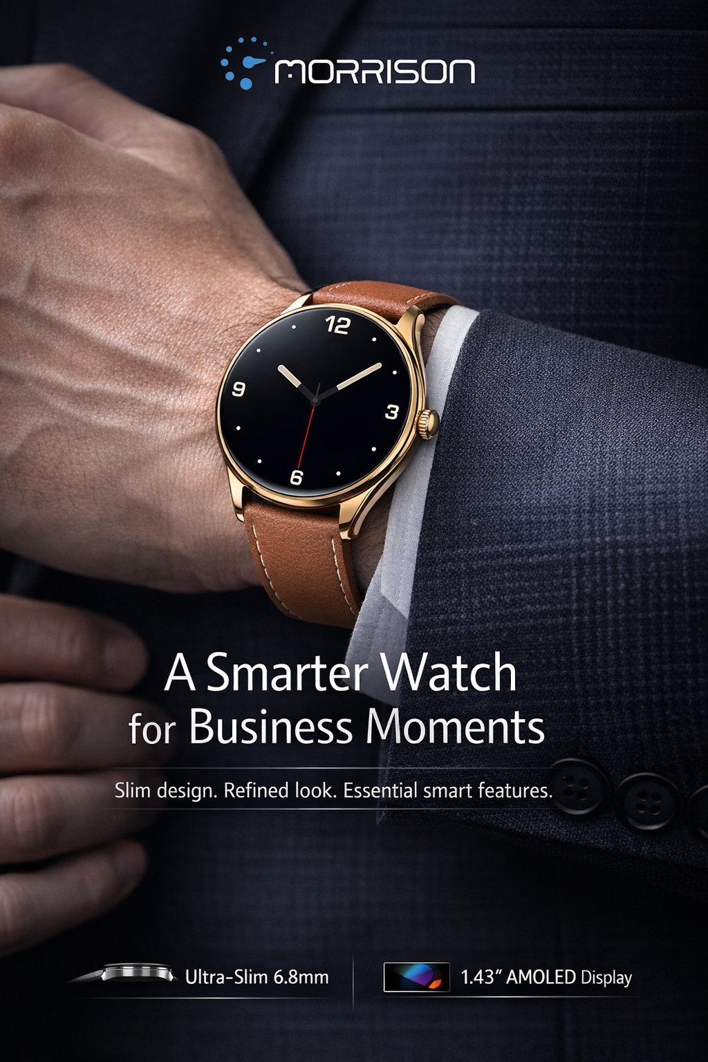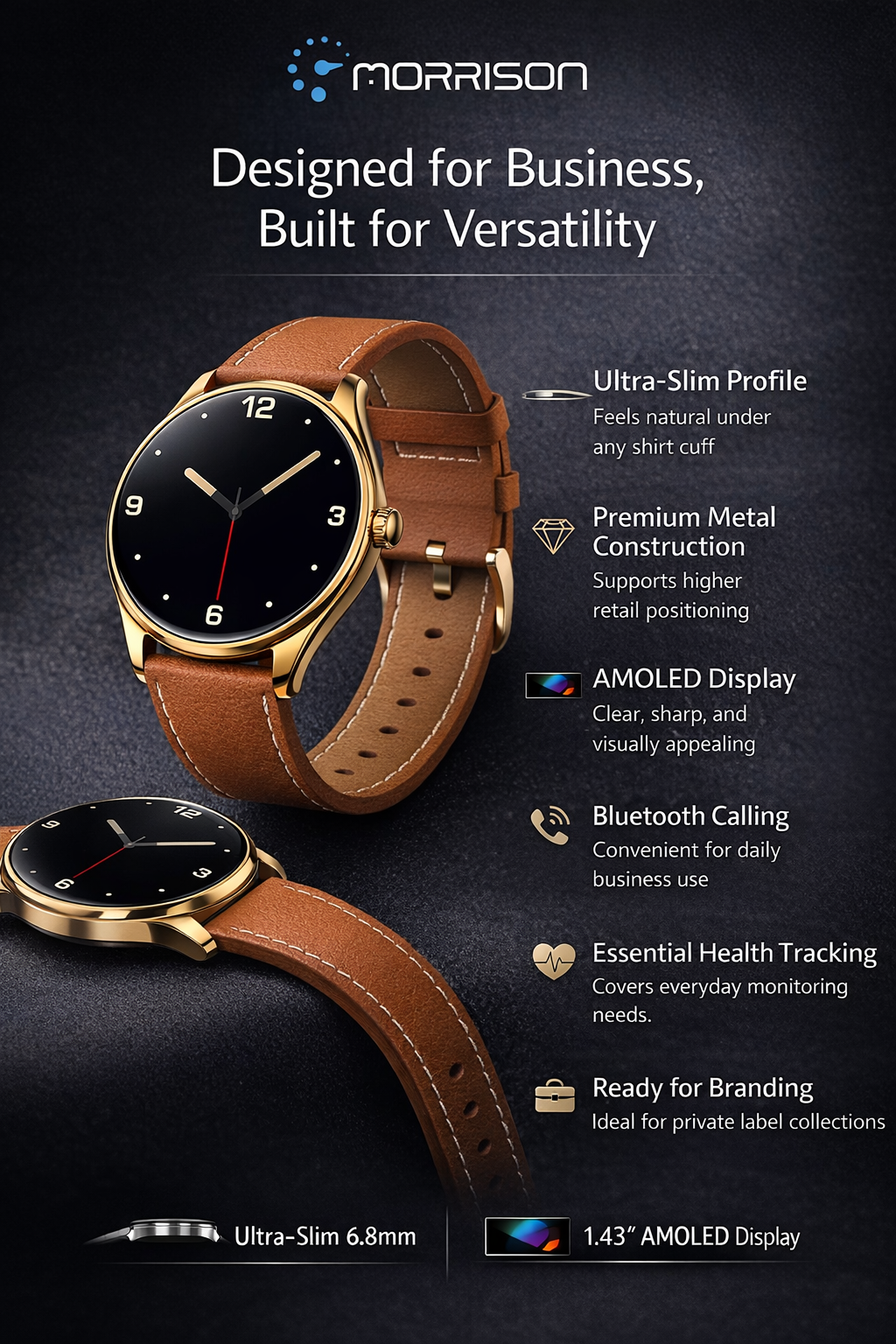 The Morrison smart watch is designed for modern users who want a premium blend of business elegance, fashion styling, and daily smart performance. With a 1.43-inch AMOLED display, ultra-thin 6.8mm body, durable metal case, Bluetooth calling, Bluetooth music, precise health monitoring, and 100+ sports modes, this watch is built for work, fitness, travel, and lifestyle use. It is an ideal IP68 waterproof fashion sports elegant luxury smart watch for OEM projects, private label programs, and retail distribution.