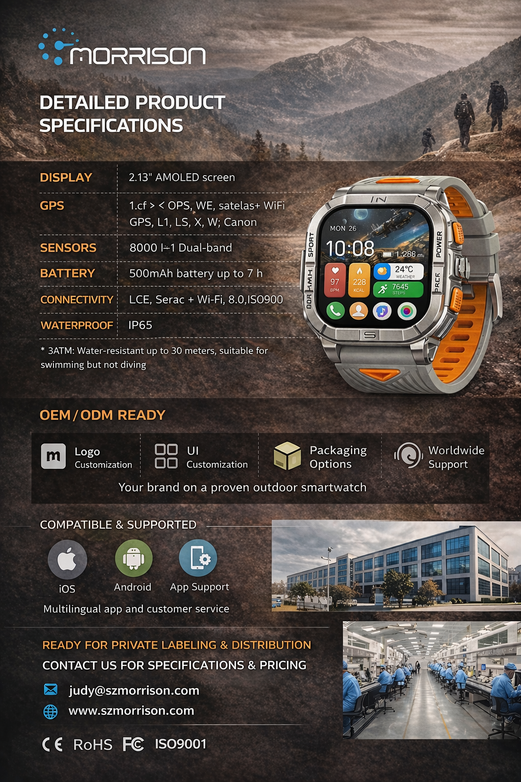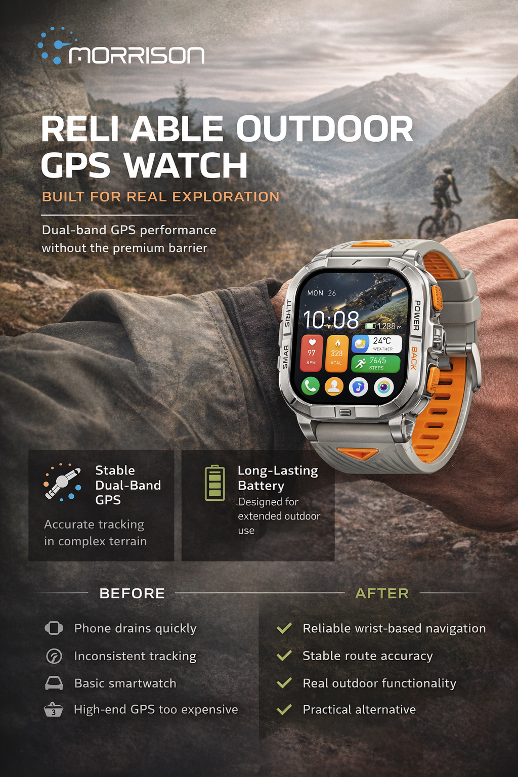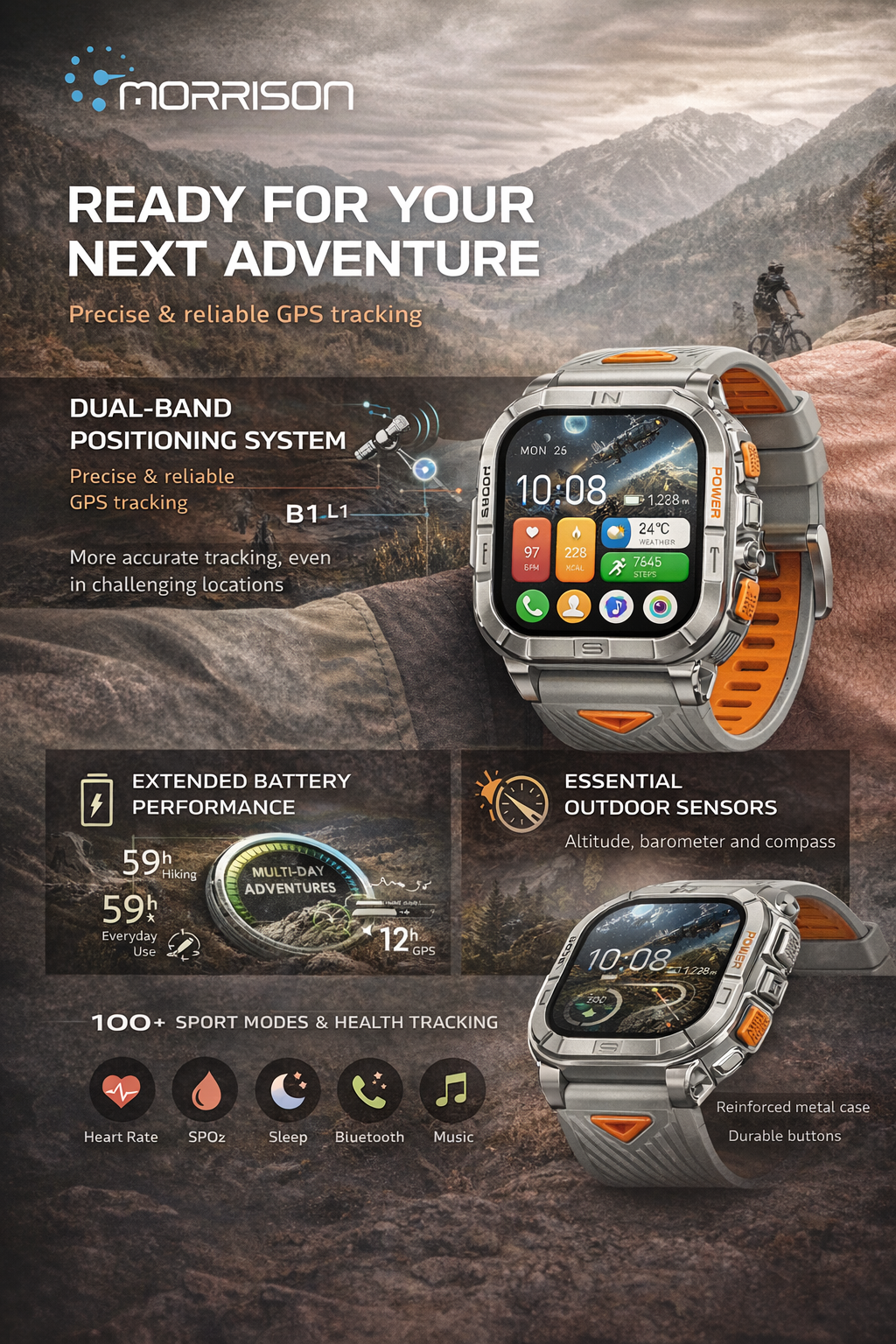 The Morrison smart watch is built for users who need precise outdoor positioning, rugged styling, and full-day smart health tracking in one premium wearable. Featuring a large 2.13-inch AMOLED display, dual-band GPS, Bluetooth calling, Bluetooth music, and comprehensive fitness monitoring, this IP68 waterproof fashion sports elegant luxury smart watch is ideal for outdoor adventure, training, travel, and everyday use.