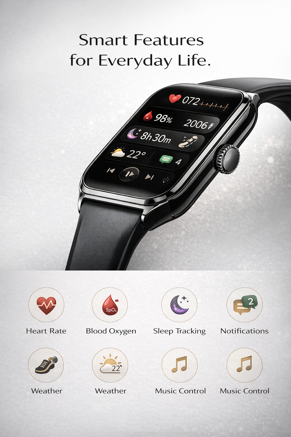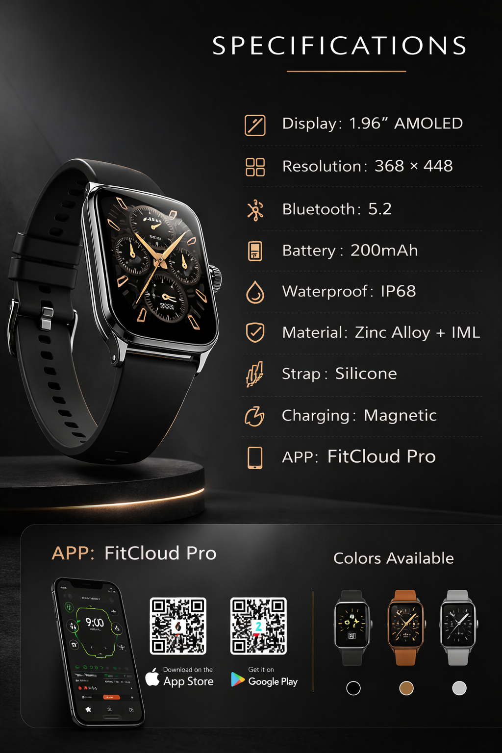 The Morrison curved AMOLED smart watch combines elegant business style with advanced smart technology. Featuring a large 1.96‑inch AMOLED display with 368×448 resolution, a premium metal body, and an ultra‑thin 7.5mm design, this smartwatch delivers both comfort and style. Equipped with Bluetooth calling, Bluetooth music, advanced health sensors, and over 100 sport modes, it is designed for modern active lifestyles. With IP68 waterproof protection and a long‑lasting 200mAh battery, it is suitable for work, sports, and daily use. OEM customization is supported for global partners.