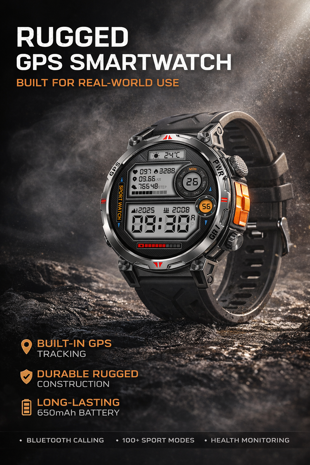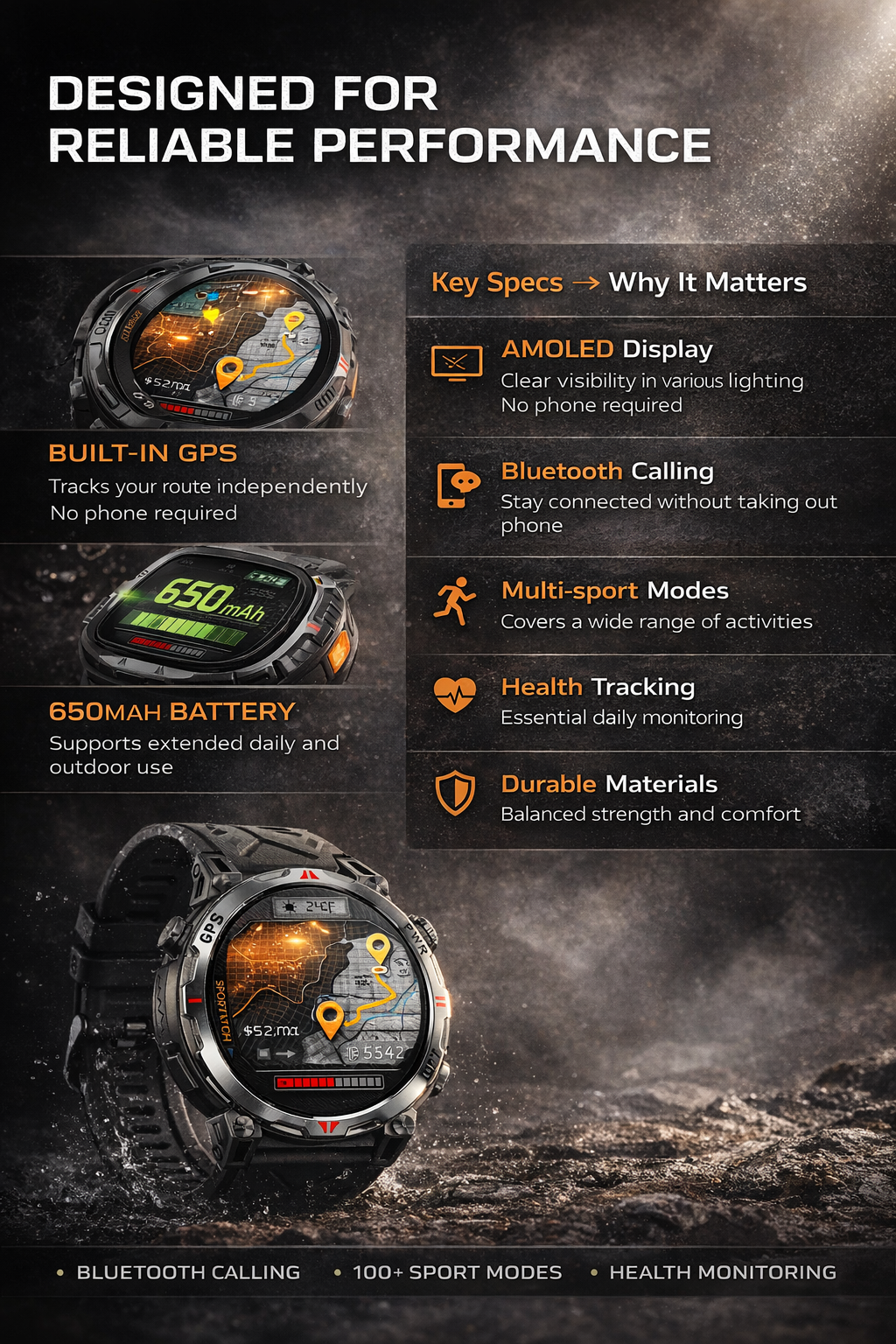 With its eye-catching round dial, durable housing and bright AMOLED display, this smartwatch delivers both function and style. The built-in GPS helps support route and activity positioning, while Bluetooth calling keeps communication convenient on the go. Advanced health functions such as heart rate, blood oxygen and sleep monitoring help users stay informed throughout the day. The 650mAh large battery supports longer usage, and the watch also includes practical features like weather, calculator, music control, remote camera, games and reminders.